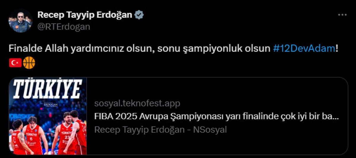 - 2025 Avrupa Basketbol Şampiyonası yarı finalinde oynanan maç sonrası Erdoğan, sosyal medyada paylaşım yaptı.