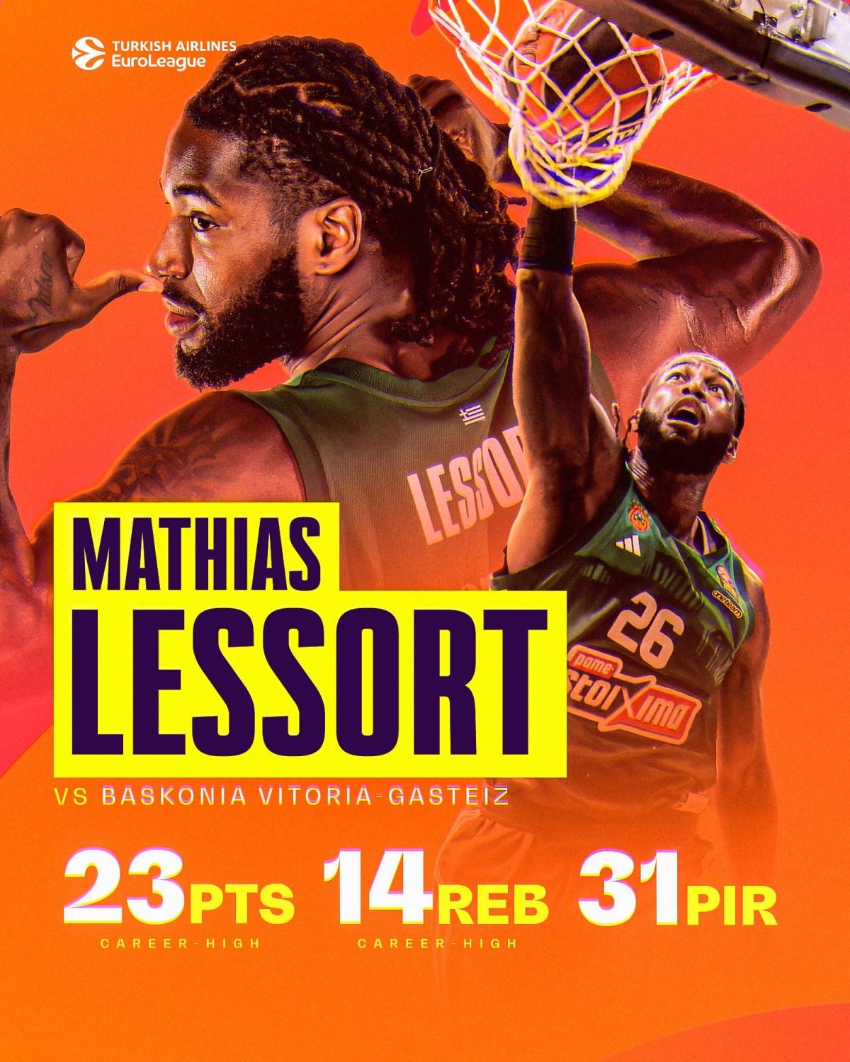 Organizasyondaki 100. maçına çıkan Lessort, takımının konuk ettiği Baskonia Vitoria-Gasteiz'i 95-81 mağlup ettiği maçta 23 sayı ve 14 ribauntla kariyerinin en iyi istatistiklerini yakaladı.