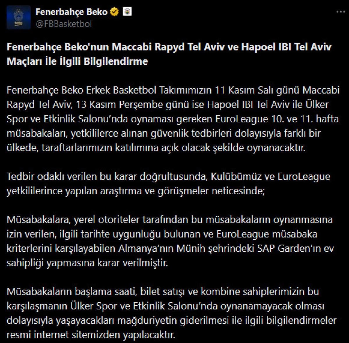 Sarı-lacivertli kulübün açıklamasına göre 11 Kasım Salı günü Maccabi Rapyd, 13 Kasım Perşembe günü ise Hapoel IBI ile Ülker Spor ve Etkinlik Salonu'nda oynaması gereken Avrupa Ligi 10. ve 11. hafta müsabakaları, güvenlik tedbirleri dolayısıyla farklı ülkede, taraftarların katılımına açık oynanacak.