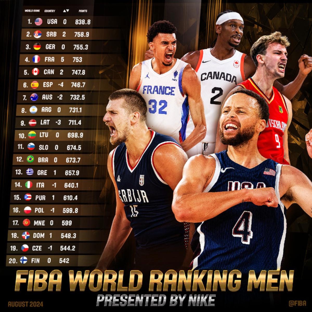 Uluslararası Basketbol Federasyonu (FIBA), Paris 2024 Olimpiyat Oyunları’nın tamamlanmasının ardından yeni dünya sıralamasını açıkladı.