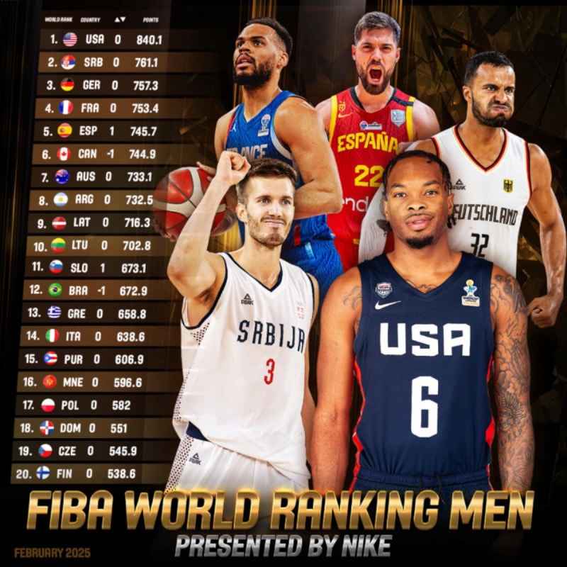 FIBA'nın resmi internet sitesinden yapılan açıklamada, sıralamada ilk 4 sırada yer alan ülkelerin yeri değişmedi.