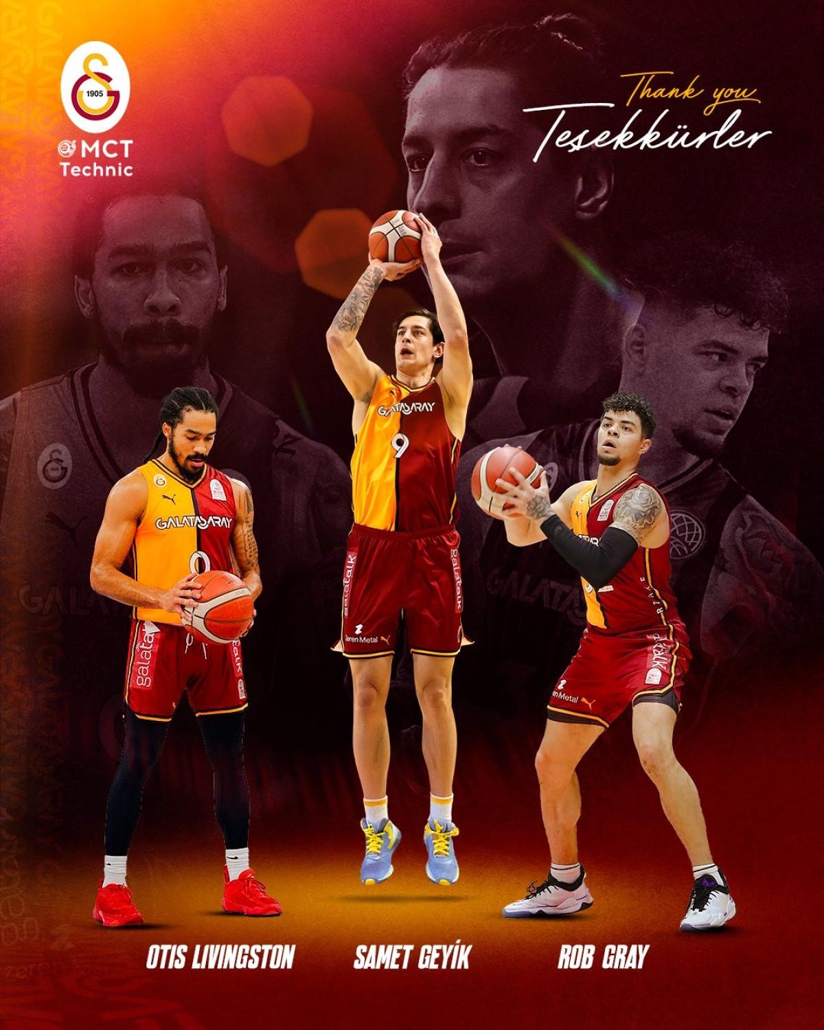 2023-2024 sezonu başında kulübümüze katılan Samet Geyik ile 2024-2025 sezonunda kadromuza dahil olan Rob Gray ve Otis Livingston'a, Galatasaray Spor Kulübü olarak bugüne kadar verdikleri emekler için teşekkür eder; profesyonel kariyerlerinin bundan sonraki bölümünde kendilerine başarılar dileriz.