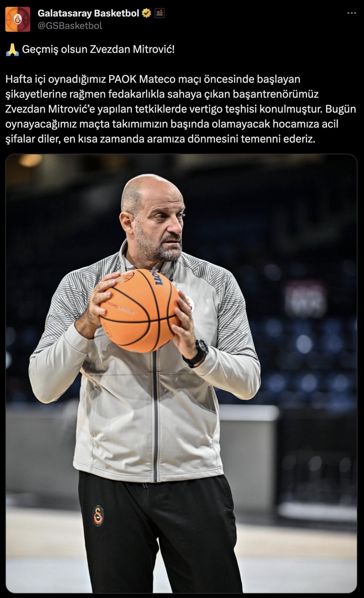 Galatasaray Başantrenörü Zvezdan Mitrović'e vertigo teşhisi konuldu. Kulüpten yapılan açıklamaya göre tecrübeli çalıştırıcı, Fenerbahçe maçında kenarda yer almayacak.