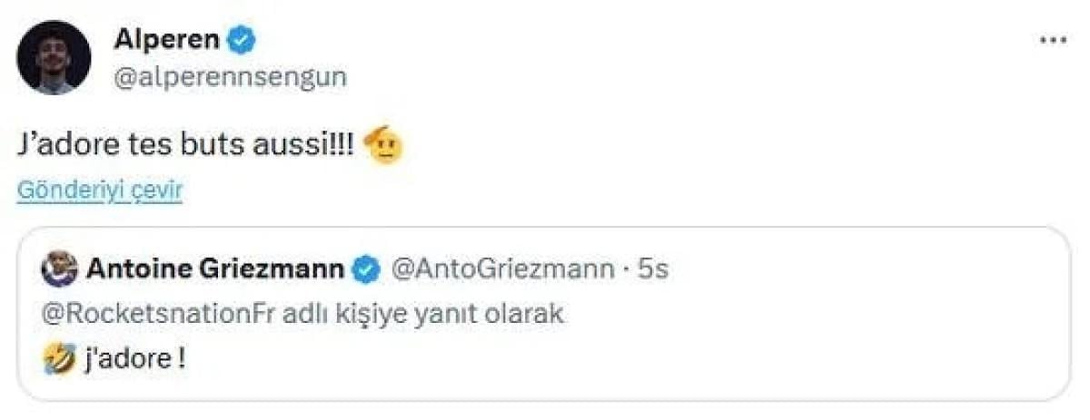 Griezmann'a yanıt veren Alperen Şengün ise, "Ben de senin gollerini beğeniyorum!" ifadelerini kullandı.