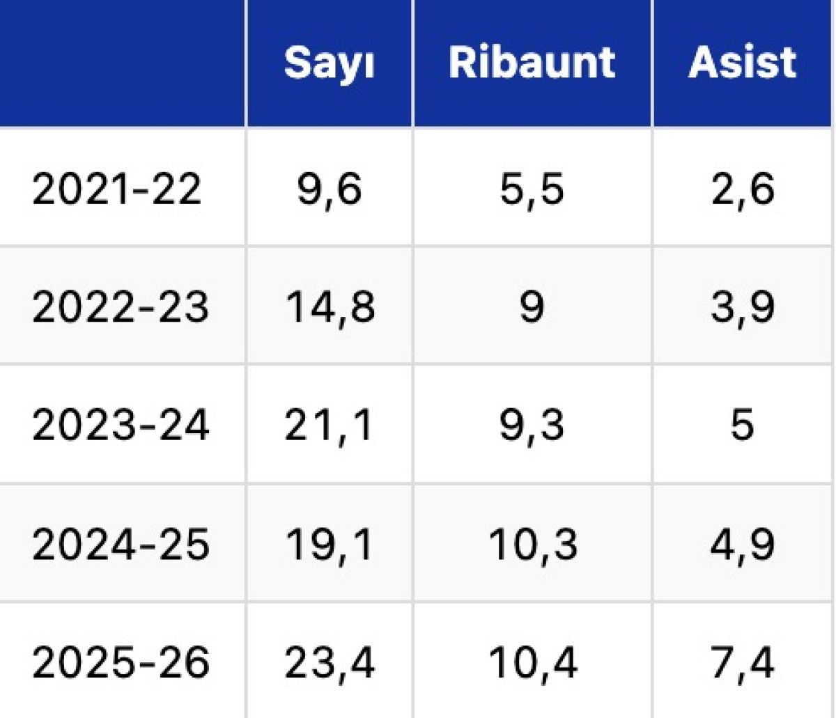 - Bu sezon 23,4 sayı, 10,4 ribaunt ve 7,4 asist ortalamalarına ulaşarak takımı için kritik bir rol oynuyor.