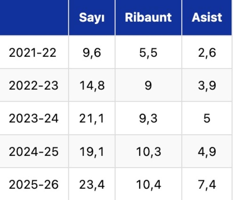 Milli sporcunun 5 sezondaki ortalamaları şöyle: