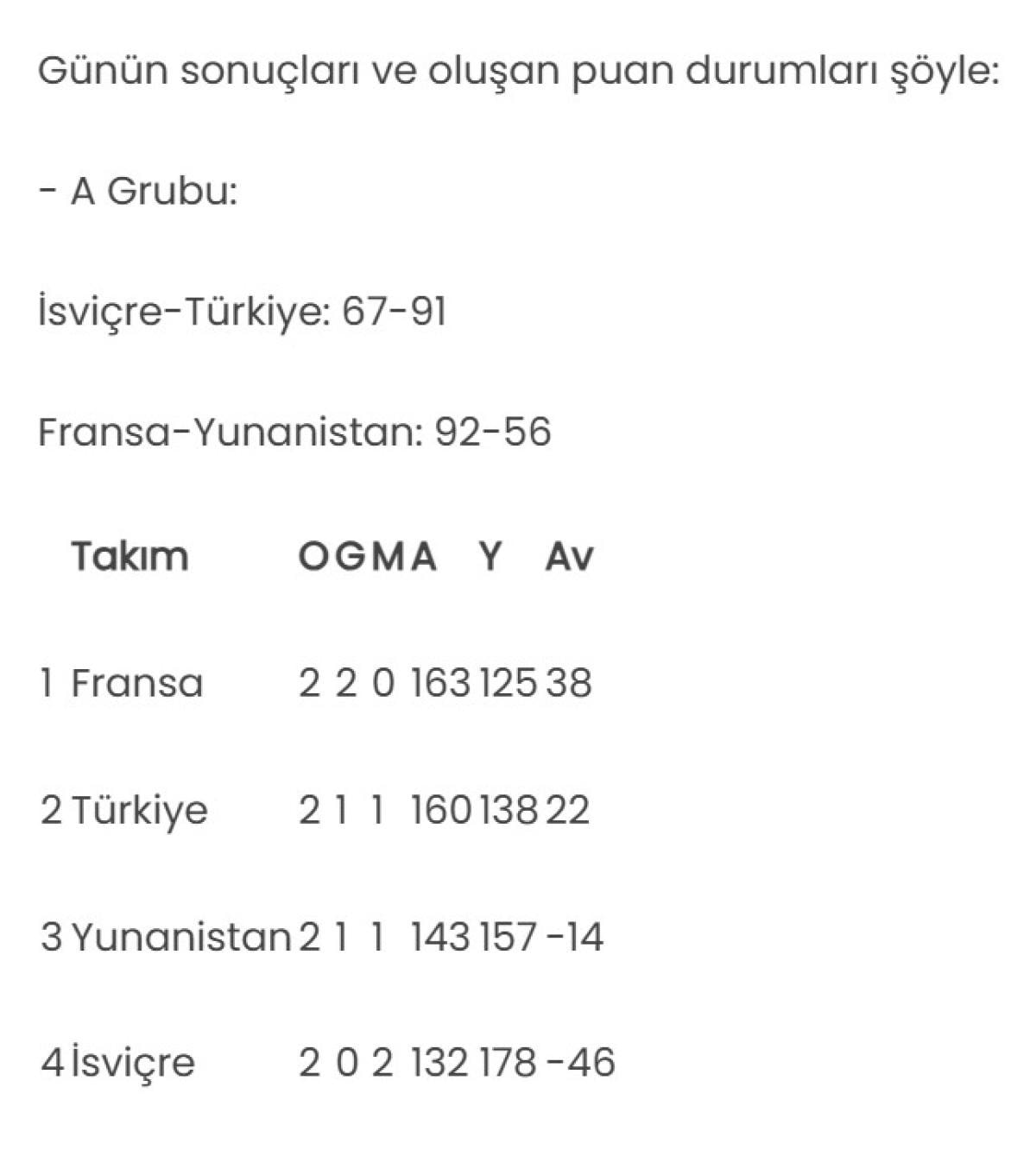 Karşılaşmalarını Yunanistan'da oynayan A Milli Kadın Basketbol Takımı, A Grubu'ndaki ikinci maçında İsviçre'yi 91-67 yendi.