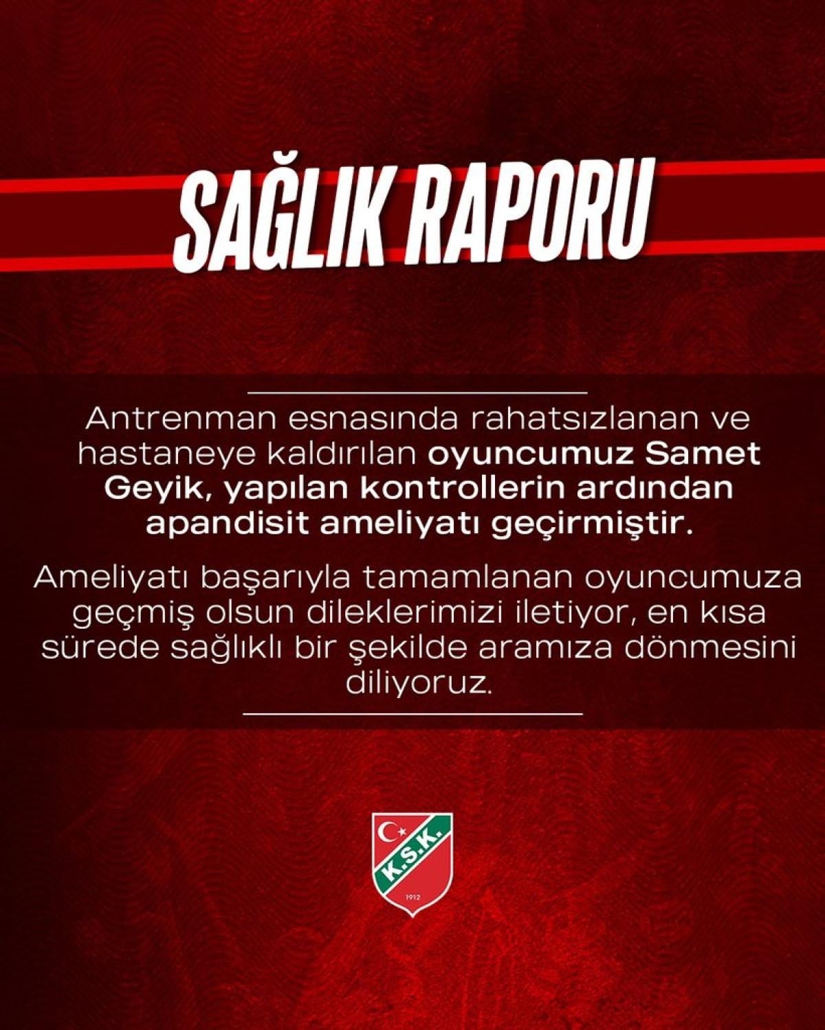 - Karşıyaka, Samet Geyik'in apandisit ameliyatı olduğunu duyurdu.