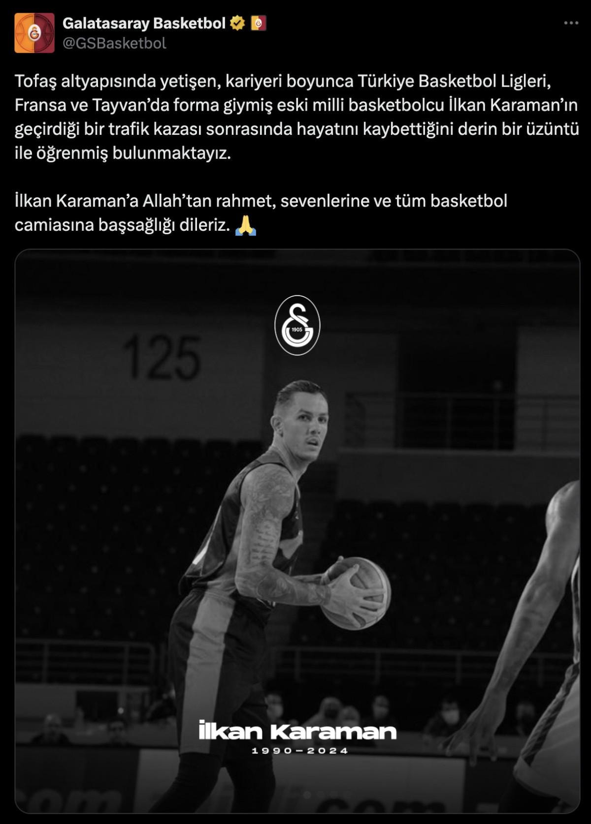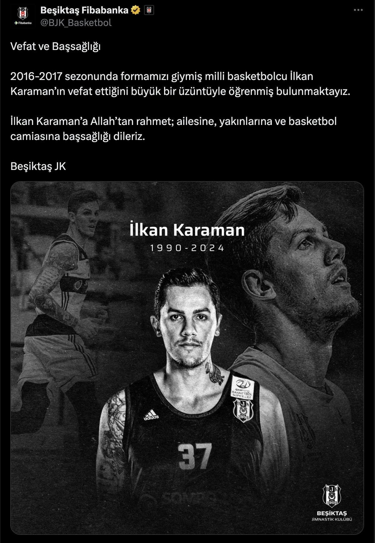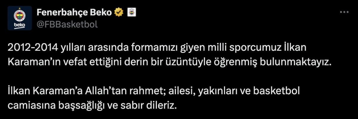 Milli takımımızın formasını giymiş oyuncularımızdan İlkan Karaman’ın vefatını derin bir üzüntü ile öğrenmiş bulunuyoruz. Türkiye Basketbol Federasyonu olarak merhuma Allah'tan rahmet, kıymetli ailesi, sevenleri ve basketbol camiamıza başsağlığı dileriz.