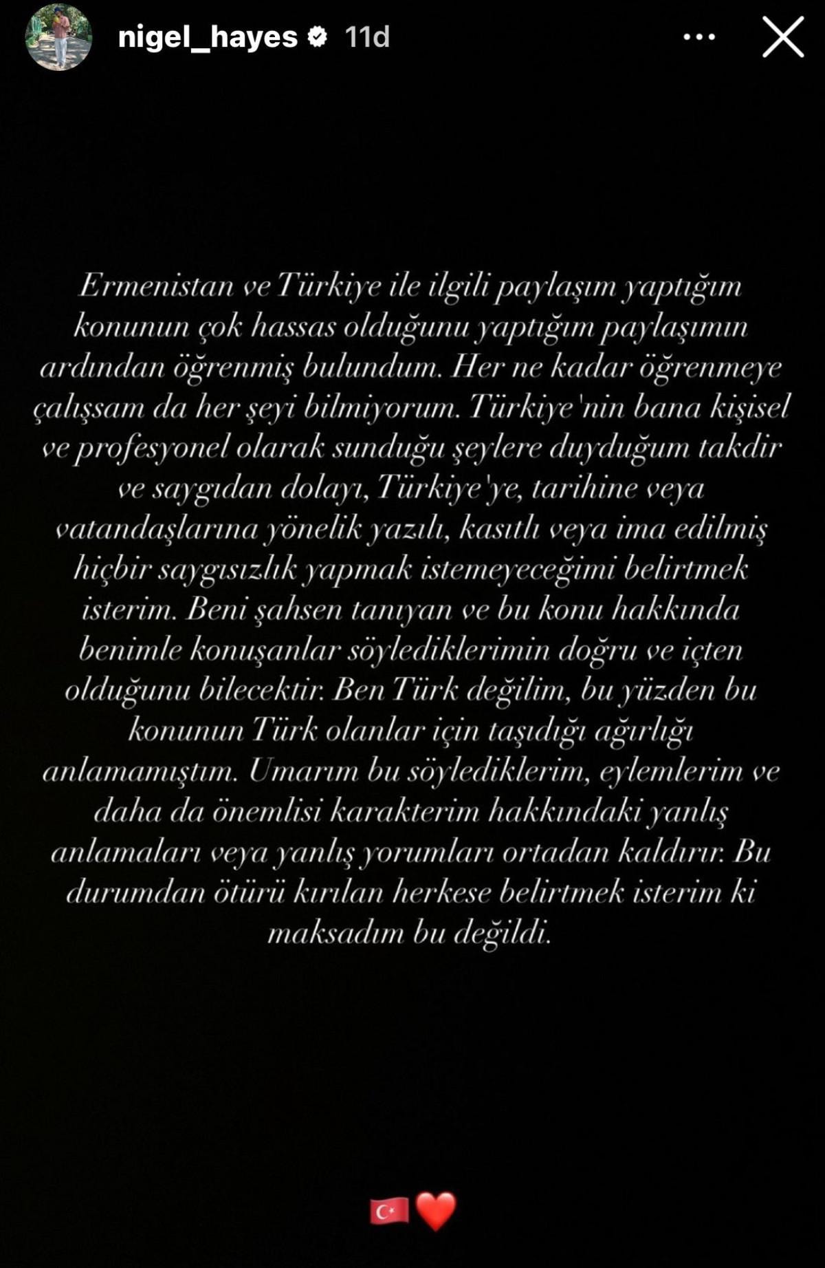 Ermenistan ve Türkiye ile ilgili paylaştığım konunun oldukça hassas olduğunu, bu durumu paylaştıktan sonra fark ettim. Her ne kadar öğrenmeye çalışsam da her şeyi bilmiyorum. Türkiye’nin bana sunduğu kişisel ve profesyonel fırsatlara duyduğum saygıdan ötürü, Türkiye’ye, tarihine veya vatandaşlarına karşı herhangi bir saygısızlık yapma niyetim yoktur. Beni tanıyan ve bu konuda benimle konuşanlar, söylediklerimin samimi ve doğru olduğunu bilir