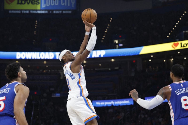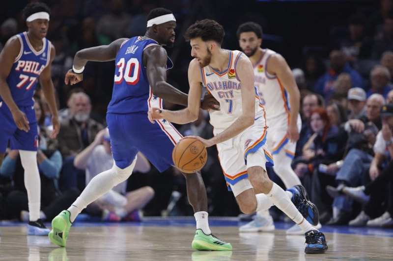 Ayak bileğindeki sakatlık nedeniyle Joel Embiid'in oynamadığı 76ers'ın 23 top kaybından Thunder, 31 sayı üretti.