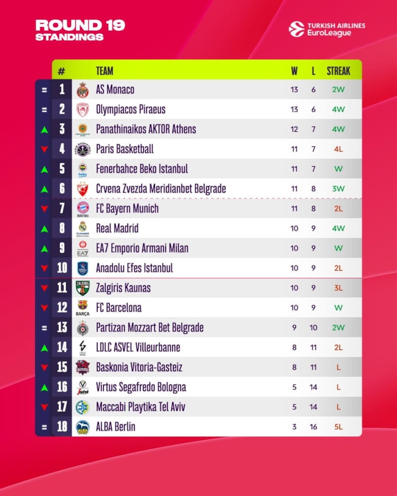 Basketbolda Avrupa'nın kulüpler bazındaki "1 numaralı" organizasyonu EuroLeague'de Fransa'yı temsil eden Monaco liderliğini sürdürdü.