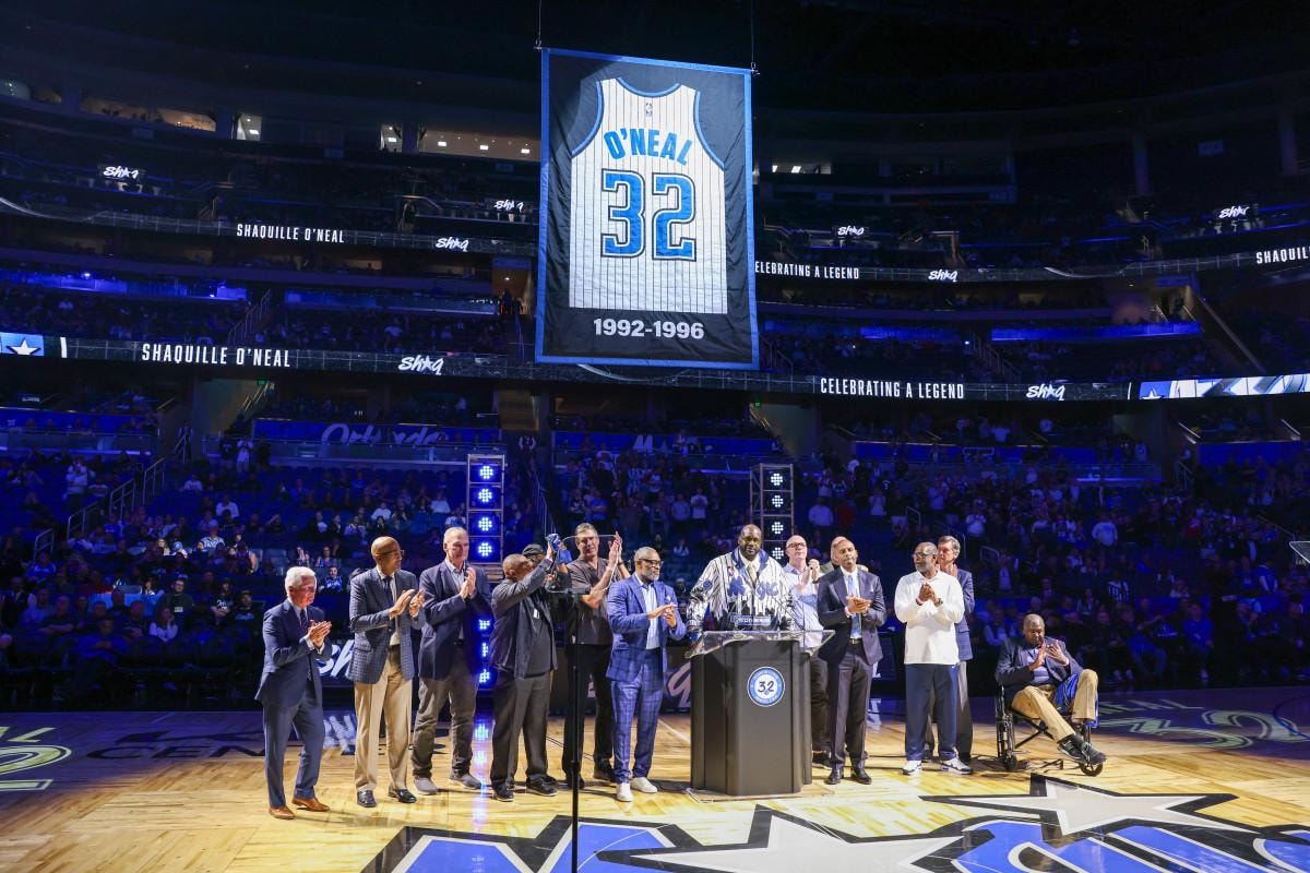 Orlando'daki Kia Center'da Oklahoma City Thunder'a 127-113 kaybedilen karşılaşmanın ardından düzenlenen seremonide O'Neal, Magic'in sahasına forması asılan ilk isim olarak tarihe geçti.