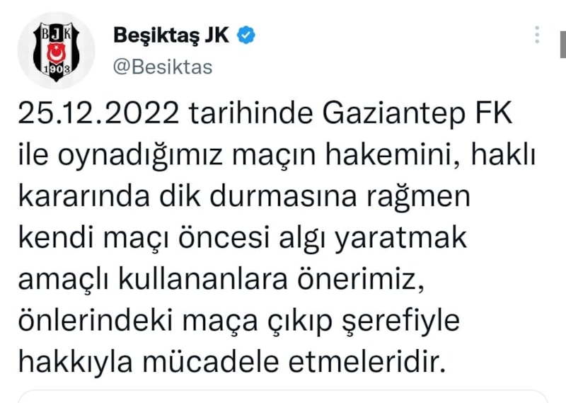 25.12.2022 tarihinde Gaziantep FK ile oynadığımız maçın hakemini, haklı kararında dik durmasına rağmen kendi maçı öncesi algı yaratmak amaçlı kullananlara önerimiz, önlerindeki maça çıkıp şerefiyle hakkıyla mücadele etmeleridir.