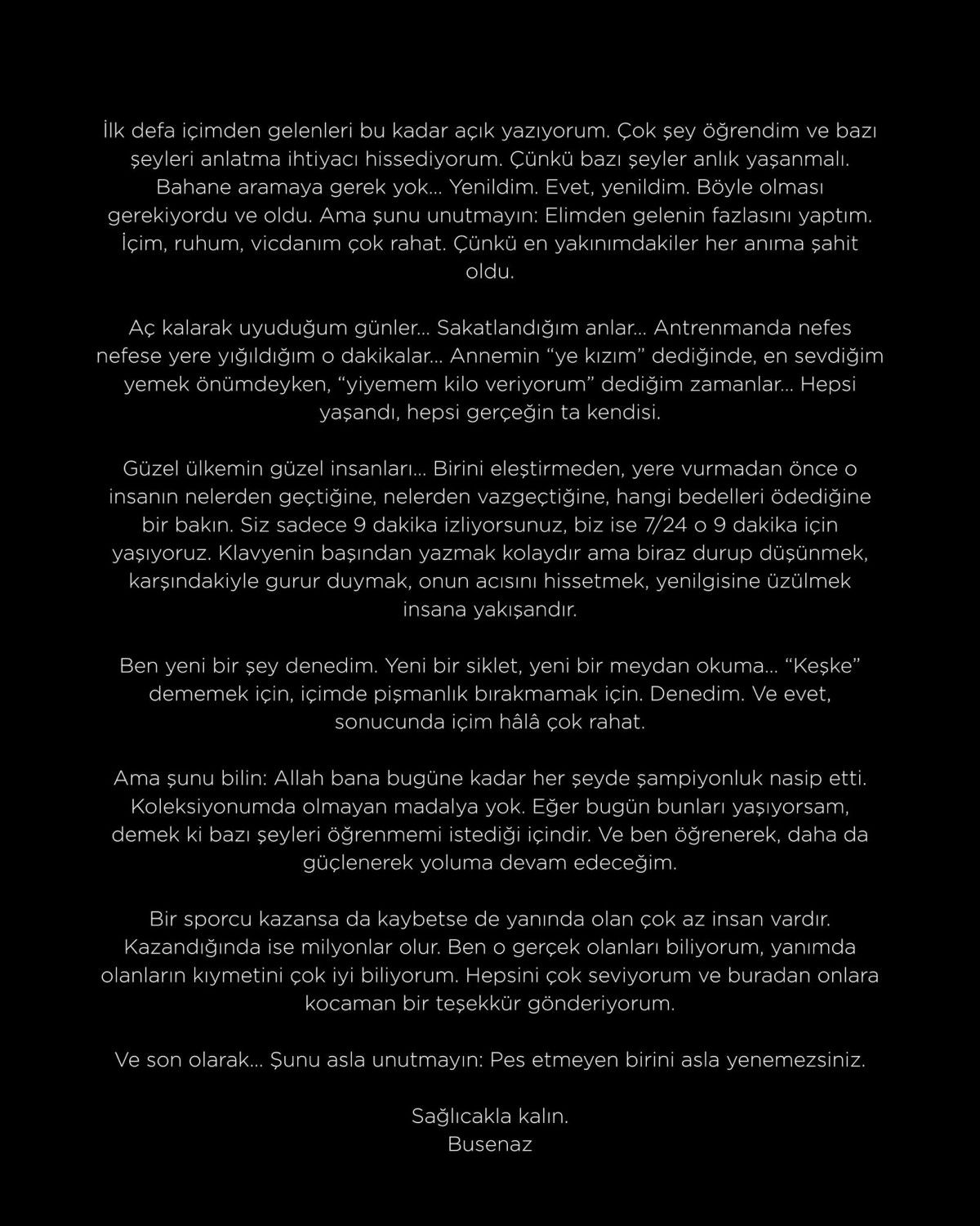 Ama şunu bilin: Allah bana bugüne kadar her şeyde şampiyonluk nasip etti. Koleksiyonumda olmayan madalya yok. Eğer bugün bunları yaşıyorsam, demek ki bazı şeyleri öğrenmemi istediği içindir. Ben öğrenerek, daha da güçlenerek yoluma devam edeceğim.