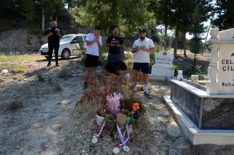 Yeşilyurt Merkez Mahallesi Mezarlığı'na kardeşi Ramazan ve aynı turnuvada minik boyda birinci olan amcasının oğlu Ferit ile gelen Celal Bayar Çilenker, babasının mezarı başında dua etti.