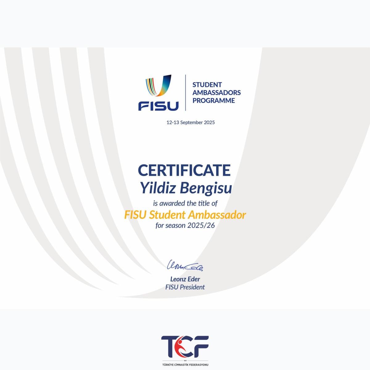 FISU Başkanı Leonz Eder'in koordinesindeki toplantıda milli sporcu Bengisu, Türkiye adına 2025-2026 dönemi FISU Sporcu Temsilcisi seçildi.