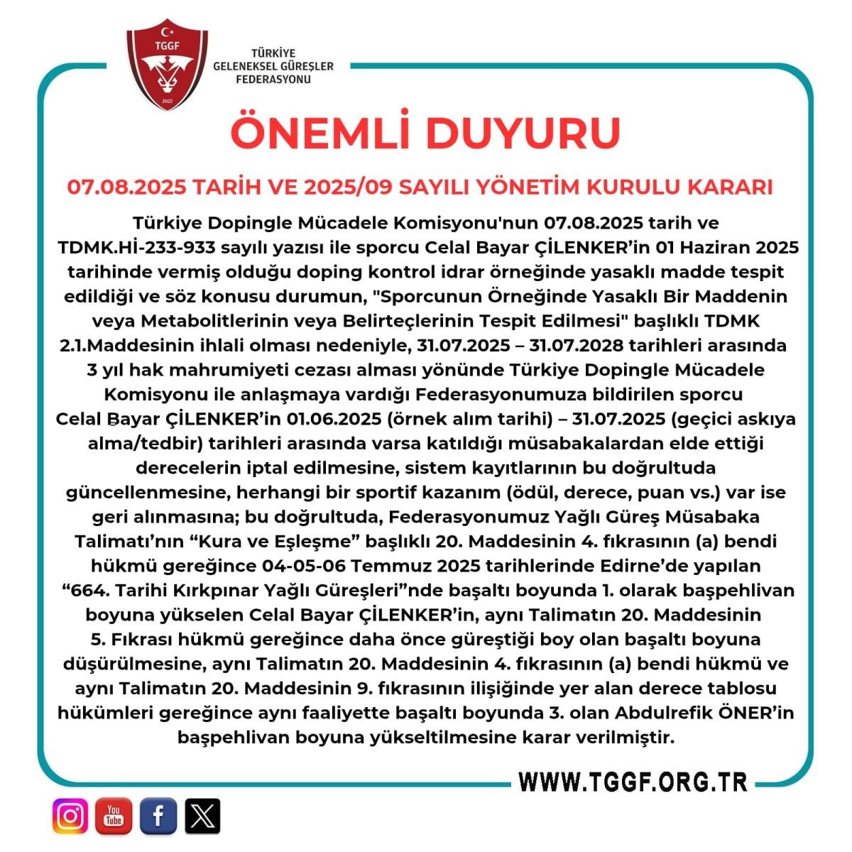 Türkiye Geleneksel Güreşler Federasyonu (TGGF), Celal Bayar Çilenker'in yasaklı madde kullandığı gerekçesiyle başaltı boyuna düşürüldüğünü duyurdu.