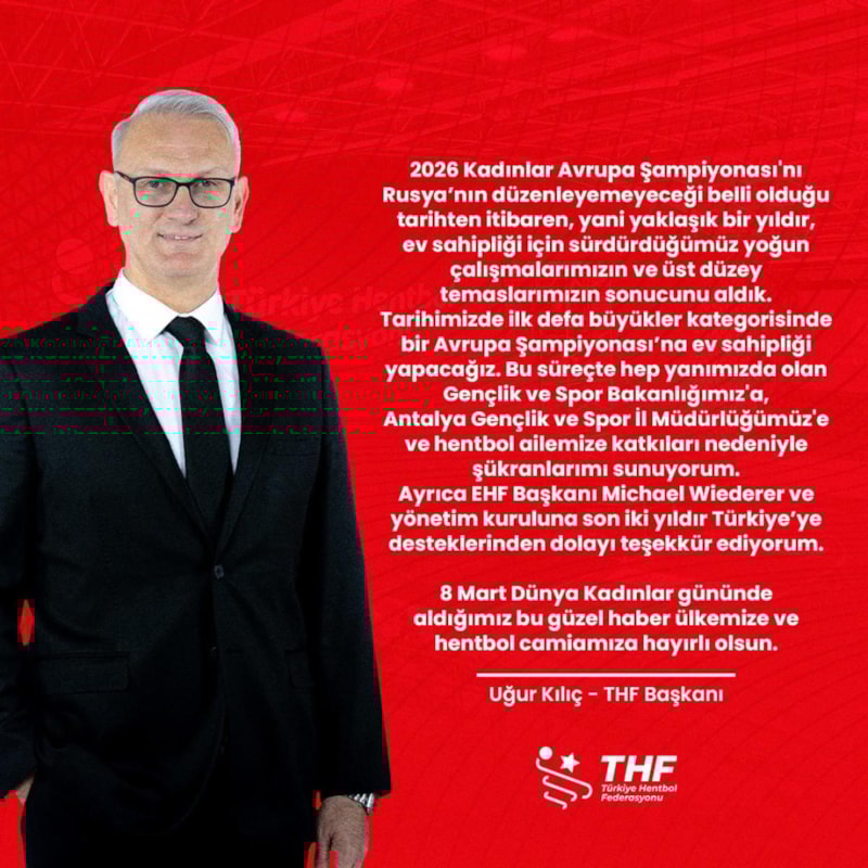 Açıklamada görüşlerine yer verilen federasyonu başkanı Uğur Kılıç, Rusya'nın şampiyonayı düzenleyemeyeceğinin belli olduğu tarihten itibaren ev sahipliği için yoğun çaba harcadıklarını ifade etti.