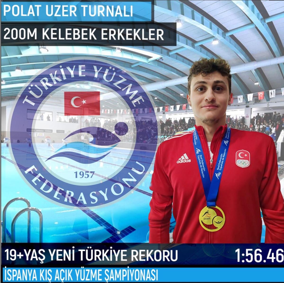 Milli yüzücü Polat Uzer Turnalı, İspanya Kış Açık Yüzme Şampiyonası'nda 200 metre kelebek erkeklerde 1.56.46'lık derecesi ile 19+ yaş yeni Türkiye rekorunu geliştirdi.