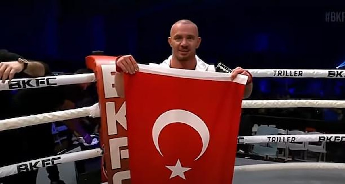 Maçı kazanan Murat Kazgan mücadele sonrası büyük bir sevinç yaşarken Türk bayrağı açmayı da ihmal etmedi.