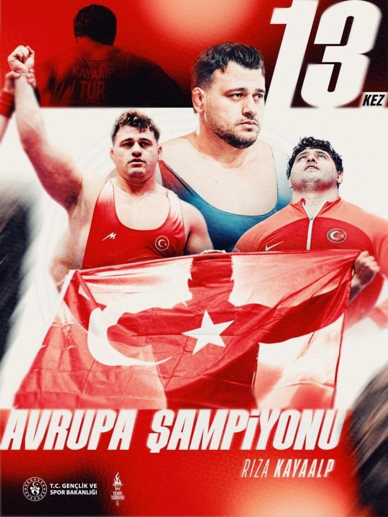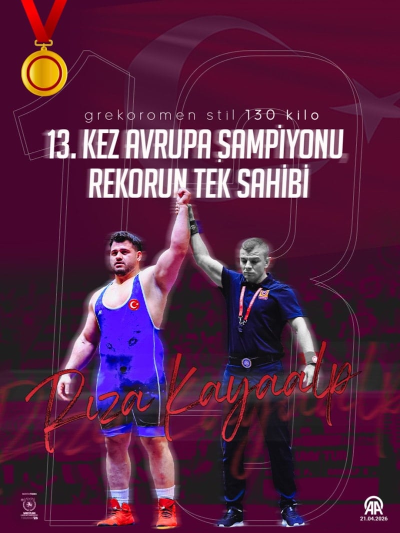 Milli sporcu Rıza Kayaalp, Avrupa şampiyonalarında 13 altın madalya kazanan ilk güreşçi ünvanını aldı. Rıza, Rus Aleksandr Karelin ile paylaştığı rekorun tek sahibi oldu.