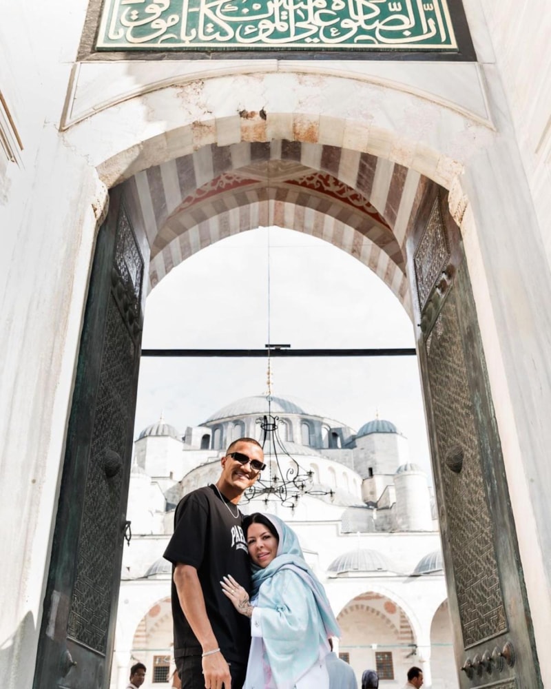 Başarılı savunmacı hafta sonu turunda eşiyle birlikte camileri gezdi.