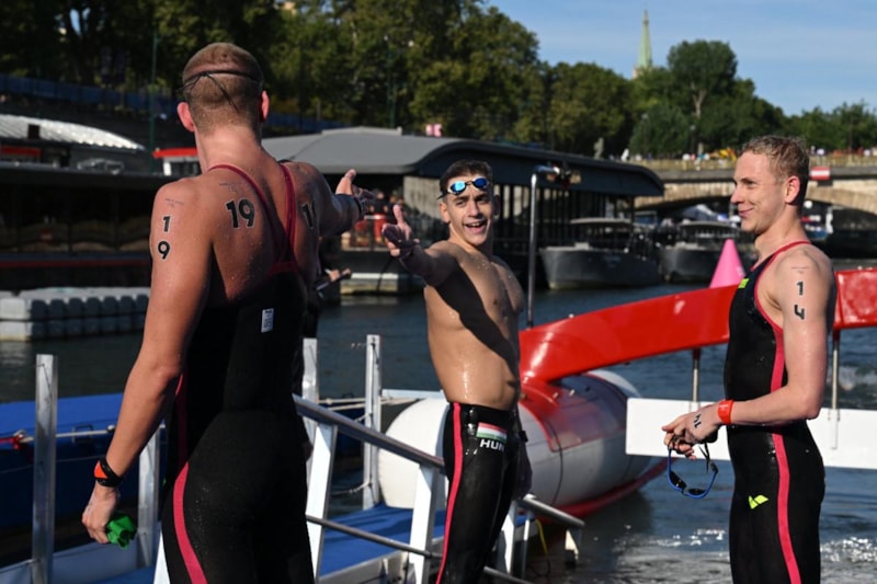 Milli yüzücüler Kuzey Tunçelli ve Emir Batur Albayrak'ın da mücadele ettiği erkekler maraton 10 kilometre mücadelesinde, Macar sporcu David Betlehem de "Yusuf Dikeç pozu"nu verenler arasında yer aldı.