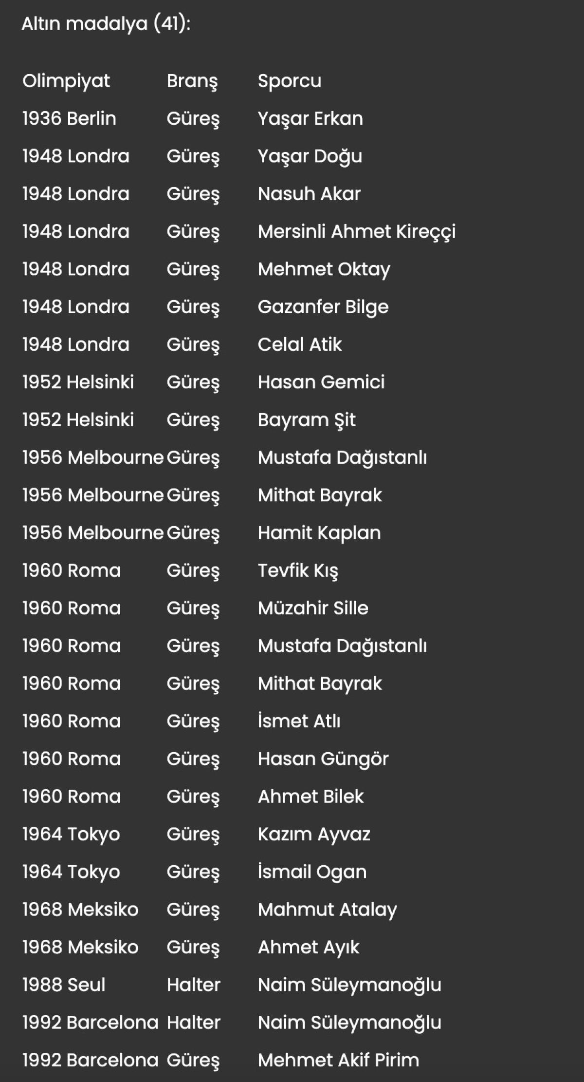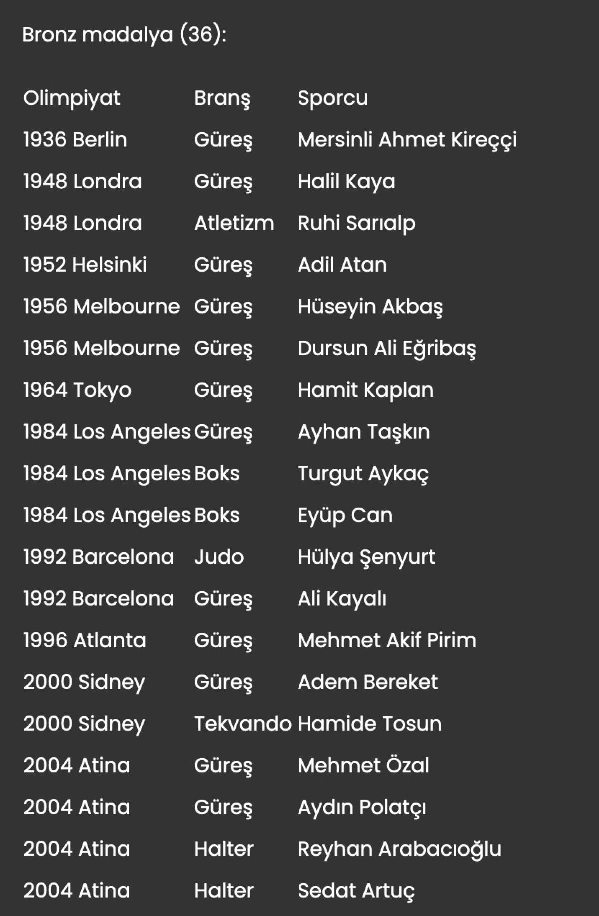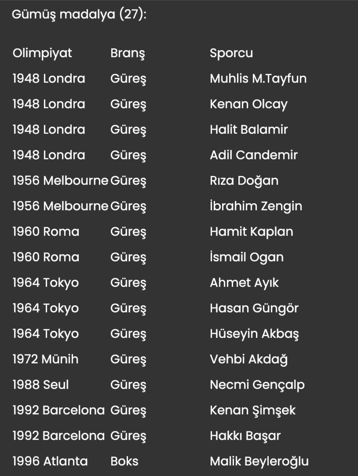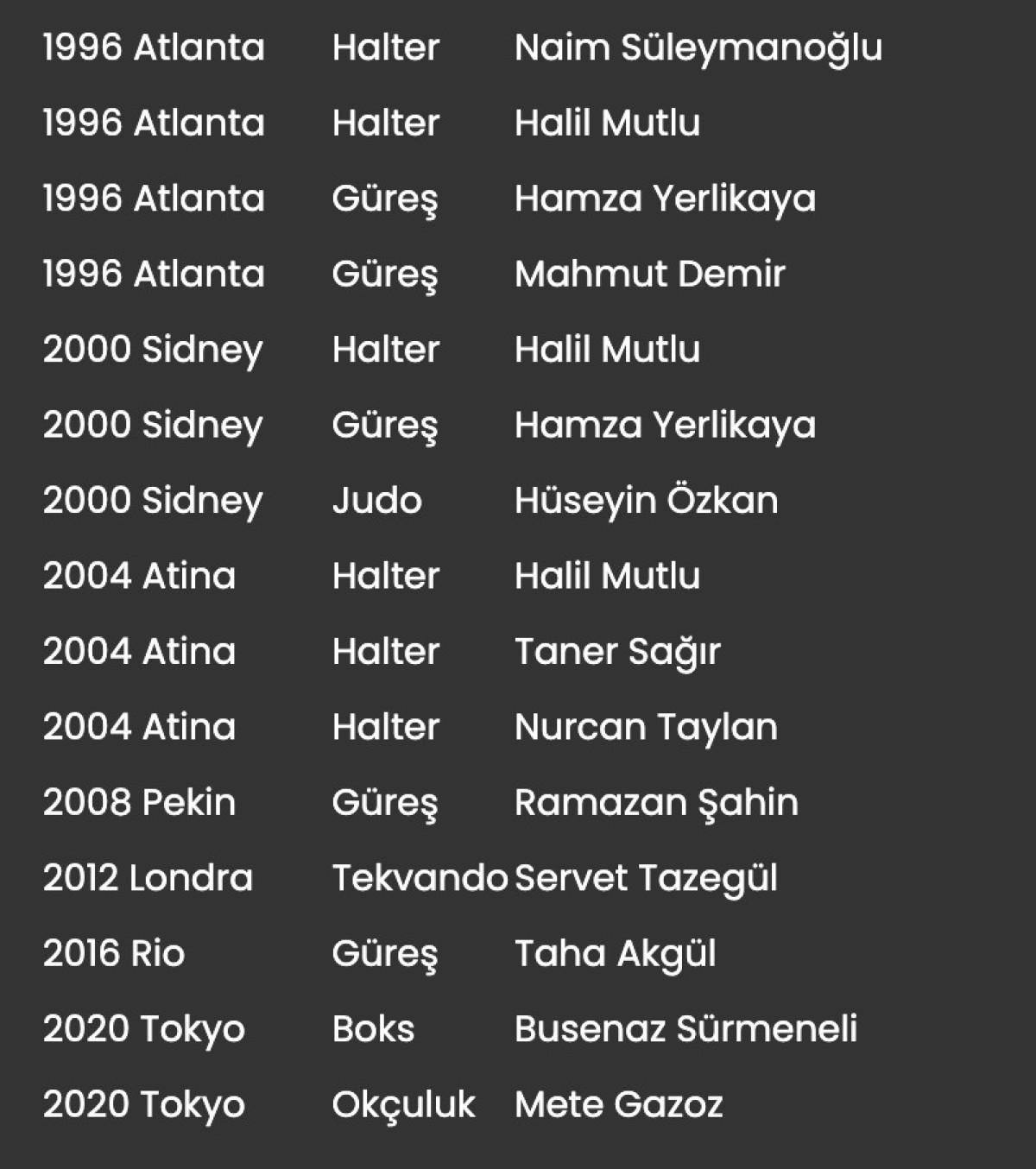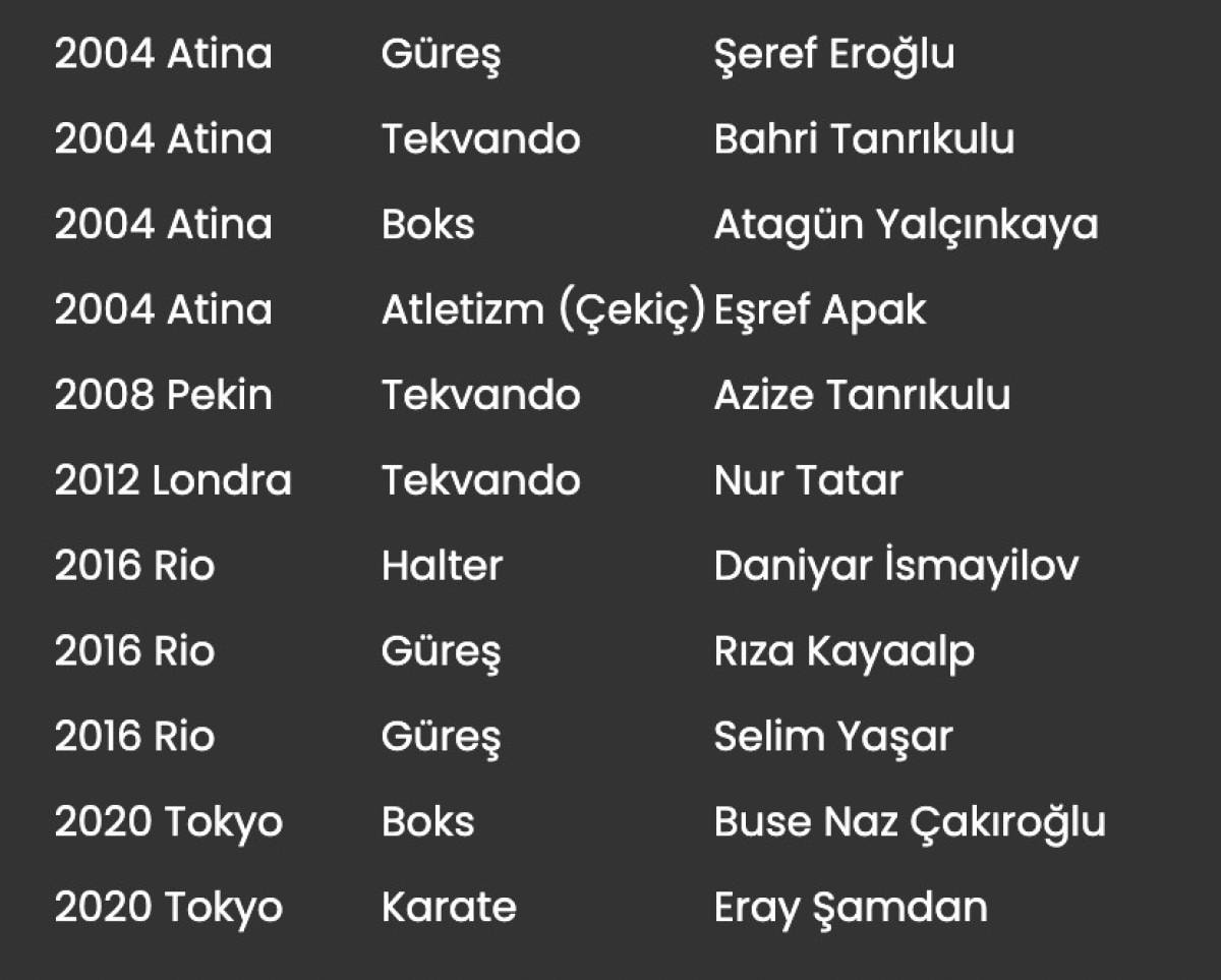 Olimpiyat oyunlarında Türkiye'ye madalya kazandıran sporcular ve branşları şöyle: