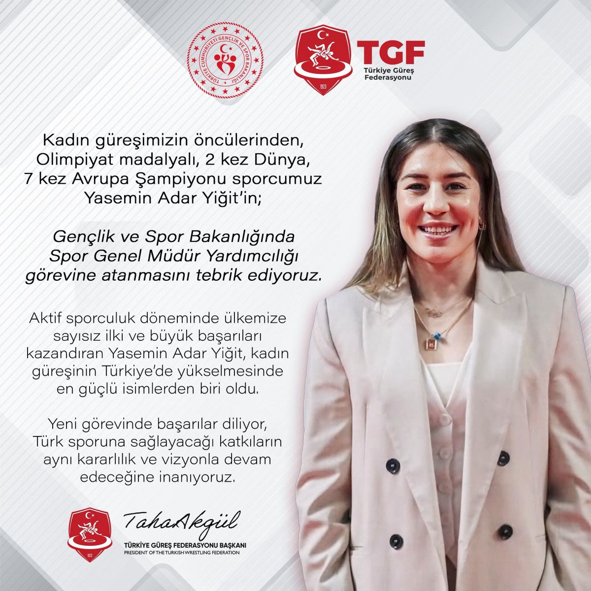 Türkiye Güreş Federasyonu'ndan yapılan açıklamada "Kadın güreşimizin öncülerinden, olimpiyat madalyalı, 2 kez dünya, 7 kez Avrupa şampiyonu sporcumuz Yasemin Adar Yiğit’in, Gençlik ve Spor Bakanlığında Spor Genel Müdür Yardımcılığı görevine atanmasını tebrik ediyoruz." denildi.