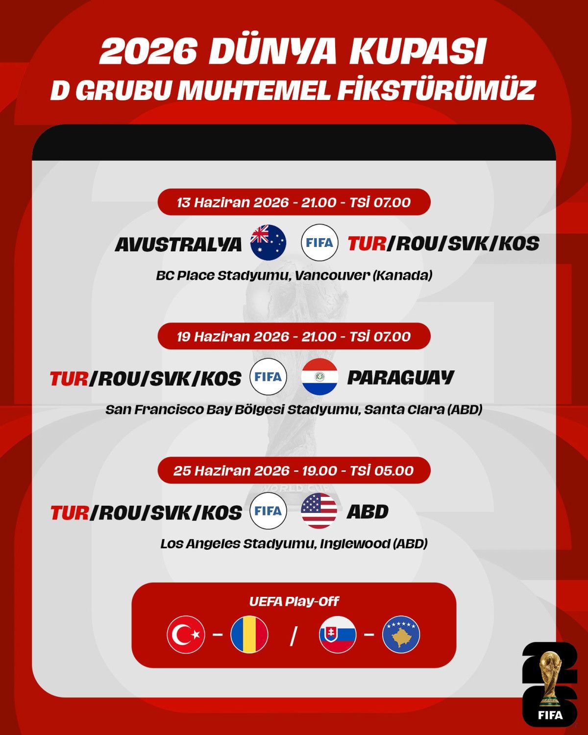 - Türkiye, Play-Off'ları geçerse D Grubu'nda Avustralya, Paraguay ve ABD ile oynayacak.