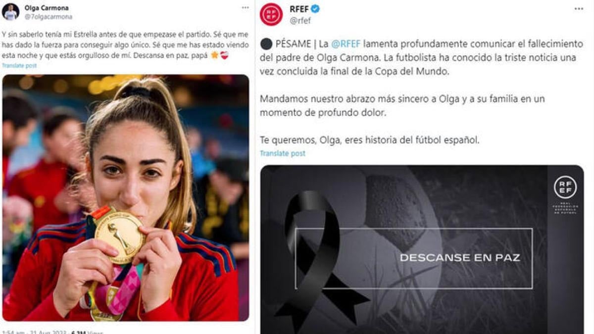 RFEF, Olga Carmona'nın babasının ölümünü bildirdiği için derin üzüntü duymaktadır. Futbolcu acı haberi Dünya Kupası finalinin ardından öğrendi. Olga ve ailesine en içten taziyelerimizi gönderiyoruz. Seni seviyoruz Olga, sen İspanyol futbolunun tarihisin.