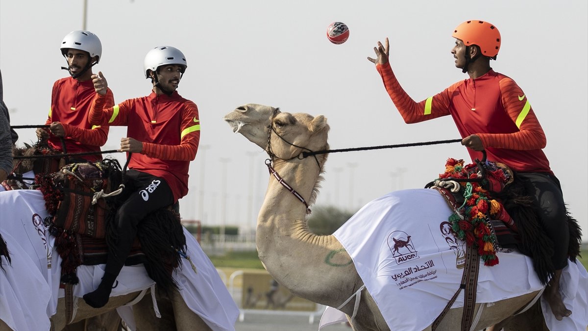 Başkent Doha'daki Şeyhaniye Meydanı'nda develer üzerinde oynanan hentbol maçını seyirciler büyük heyecanla izledi.