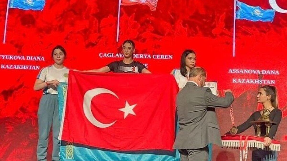 Podyuma çıkan Derya, olması gerektiği gibi Türk bayrağını, Kazakistan bayrağının önüne koydu.