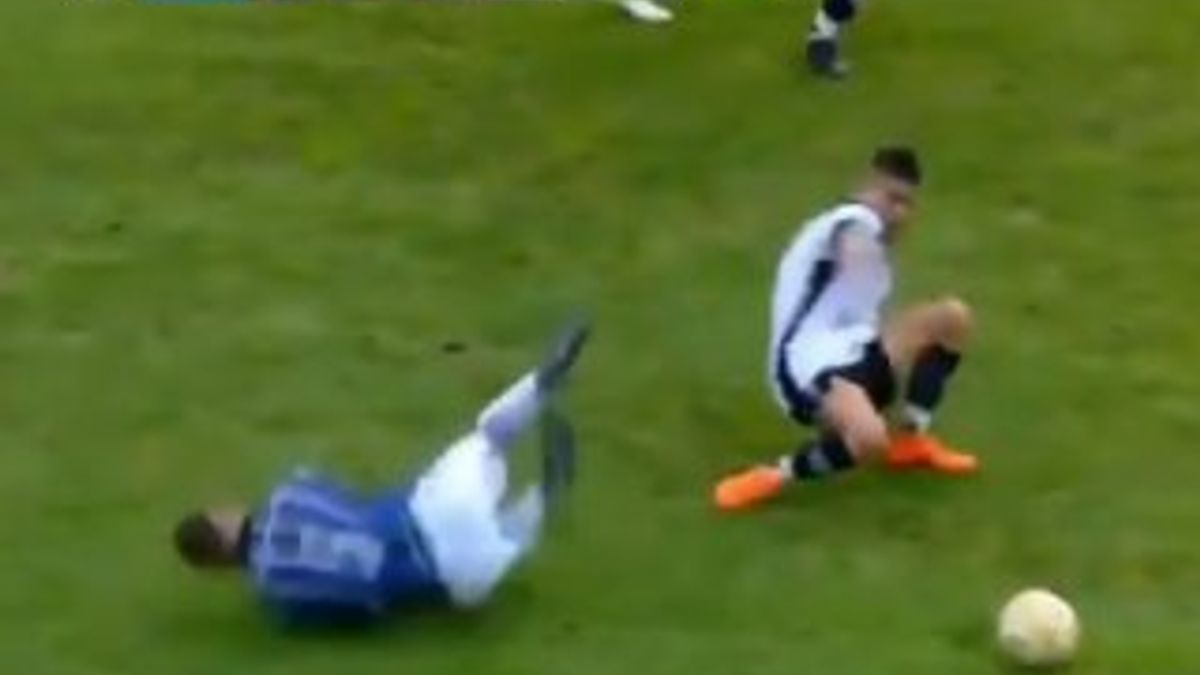 Futbolcular ikili mücadele sırasında birbirlerine kasıtlı olarak tekme atarken, mücadeleyi yöneten hakemin oyunu devam ettirmesi izleyenleri hayrete düşürdü.