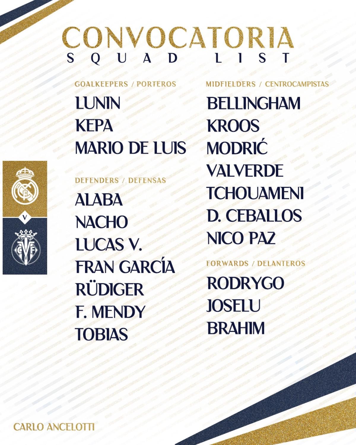 Real Madrid'in Villarreal maçı kadrosu şu şekilde:
