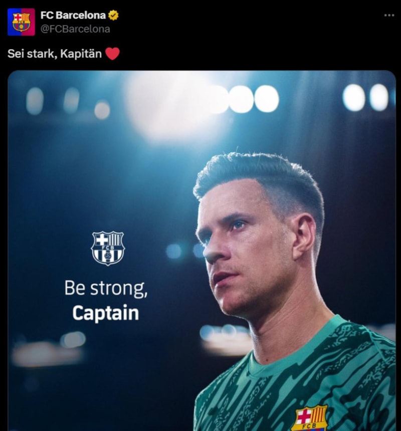 İspanya LaLiga'da Barcelona, kaptanı Marc ter Stegen'in dizindeki patella tendonunda kopma tespit edildiğini açıkladı. Deneyimli kalecinin sezonun kalan bölümünde forma giymesi beklenmiyor.