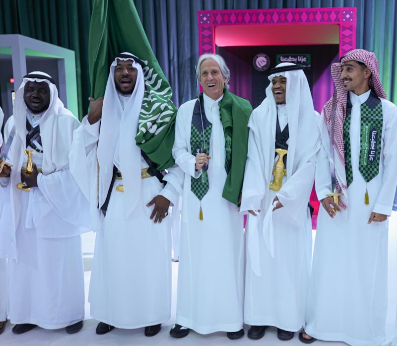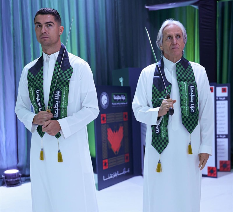 Suudi Arabistan'ın Al Nassr takımının Portekizli yıldız futbolcusu Cristiano Ronaldo ve Fenerbahçe'nin eski teknik direktörü Jorge Jesus, 23 Eylül Suudi Arabistan Milli Günü münasebetiyle özel kıyafet giyerek kılıç kuşandı. İşte o görüntüler...