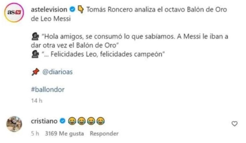 Instagram üzerinden Lionel Messi'nin Ballon d'Or ödülünü almasını eleştiren bir paylaşıma Cristiano Ronaldo'nun beğeni ve yorum göndermesi gündem oldu.