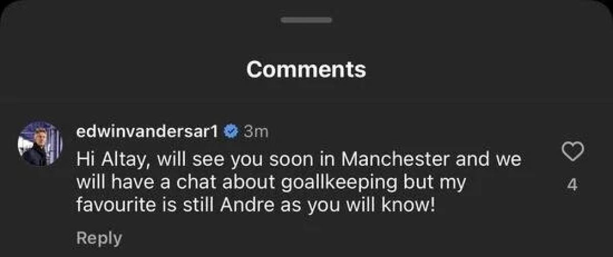 Edwin van der Sar, Altay Bayındır'a cevabında "Selam Altay, yakında Manchester'da görüşüp kalecilik hakkında sohbet edeceğiz ama bileceğin gibi benim favorim hala Andre Onana!" ifadelerini kullandı.
