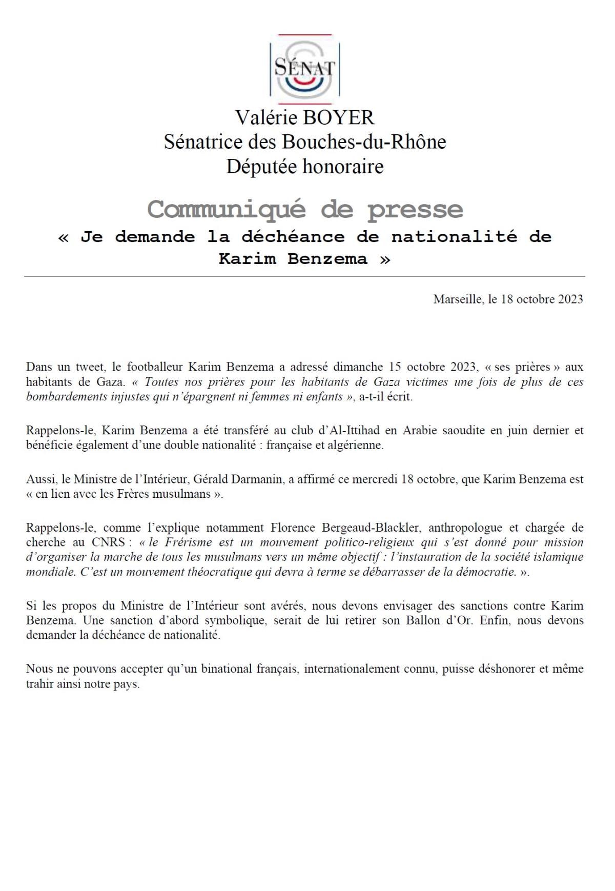 Bu dikkat çeken söylemin ardından Fransız Senatör Valerie Bouyer, daha da ileri giderek dünyaca ünlü futbolcunun vatandaşlıktan atılması ve Ballon dOr ödülünün geri alınmasını istedi.