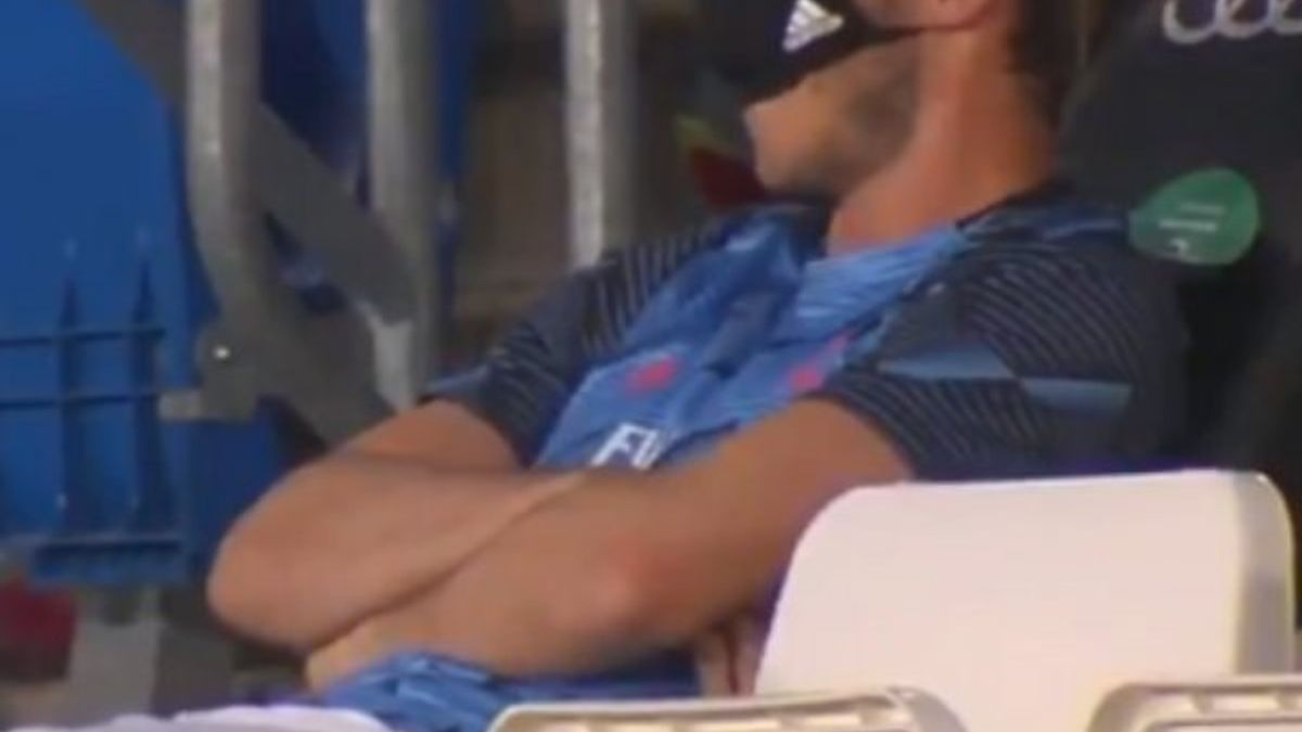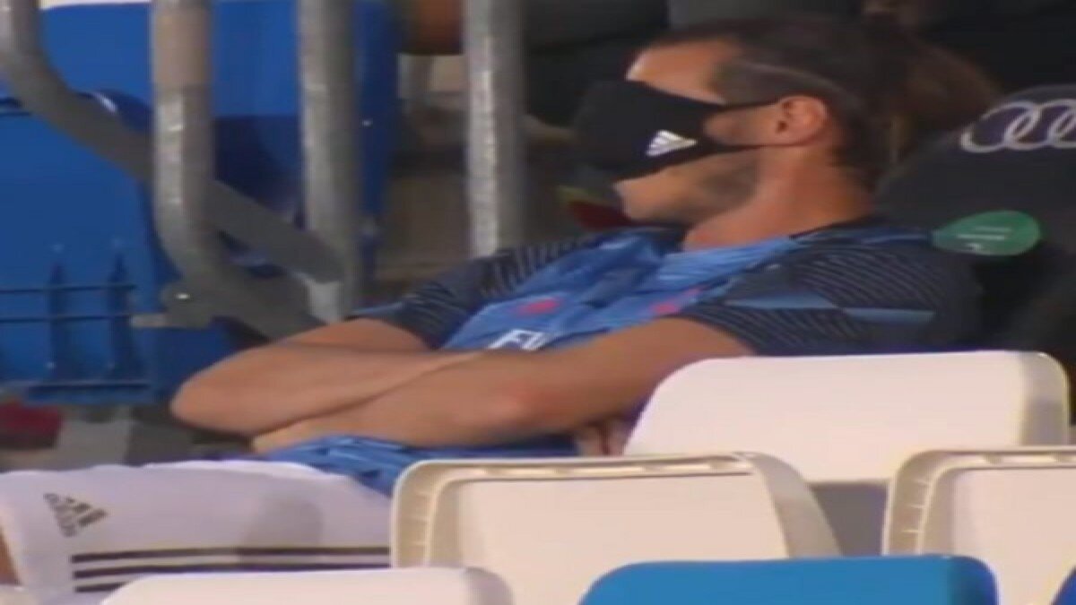 Karşılaşmaya yedek başlayan 30 yaşındaki Galli futbolcu, yedek kulübesinde otururken koronavirüs önlemleri nedeniyle takması zorunlu olan maskeyi gözüne taktı ve uyudu.