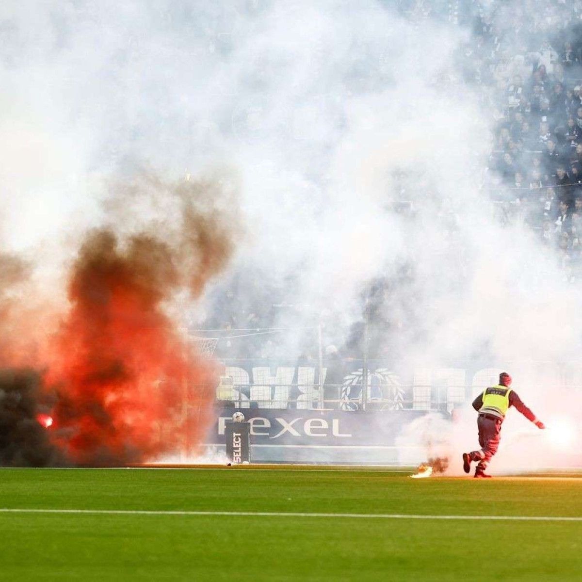 İlk maçı 3-0 kaybeden Norrköping'in sahasında oynanan rövanş mücadelesinde, takımlarının küme düşmesine tepki gösteren ev sahibi ekibin taraftarları, 85. dakikada suni çim zemine yanıcı madde atmaya başladı.