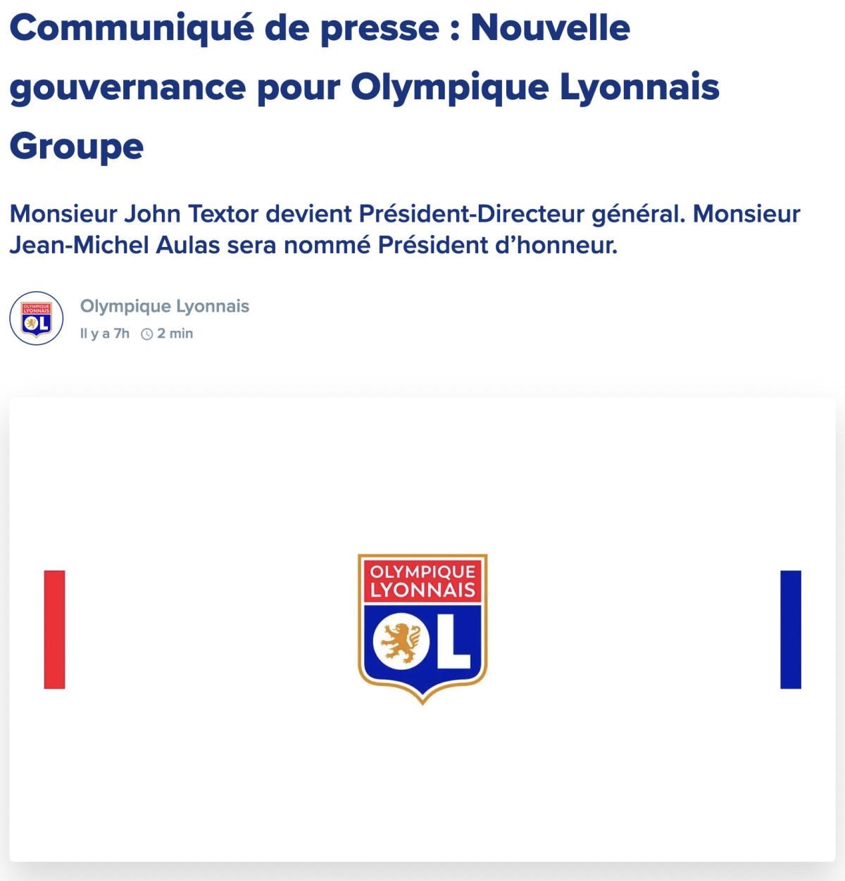 Kulüpten yapılan açıklamada, Aulas'a teşekkür edildi. Başkanlık görevini John Textor'ın yürüteceği duyuruldu.