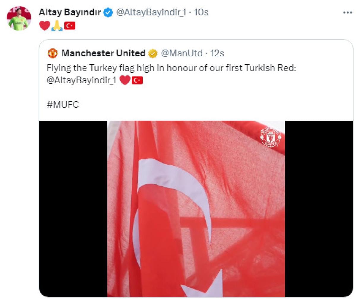 Old Trafford'da dalgalanan Türk bayrağının videosunu paylaşan İngiliz devi, söz konusu videoya Altay Bayındır'ı da etiketledi.