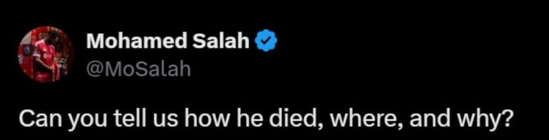 UEFA tarafından yapılan "Filistinli Pele Süleyman Al-Obaid'e veda. En karanlık zamanlarda bile sayısız çocuğa umut veren bir yetenek." şeklindeki paylaşıma Salah, Al-Obaid'nin İsrail saldırılarında öldürüldüğünün belirtilmemiş olması dolayısıyla, "Bize nasıl, nerede ve neden öldüğünü anlatabilir misiniz?" şeklinde cevap verdi.
