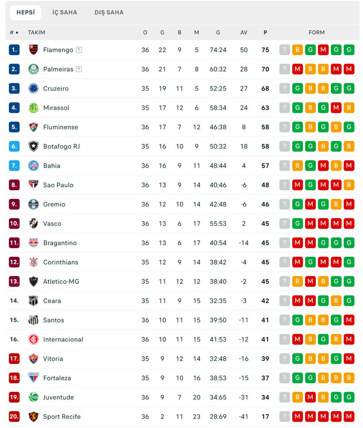 BREZİLYA LİGİ'NDE PUAN DURUMU