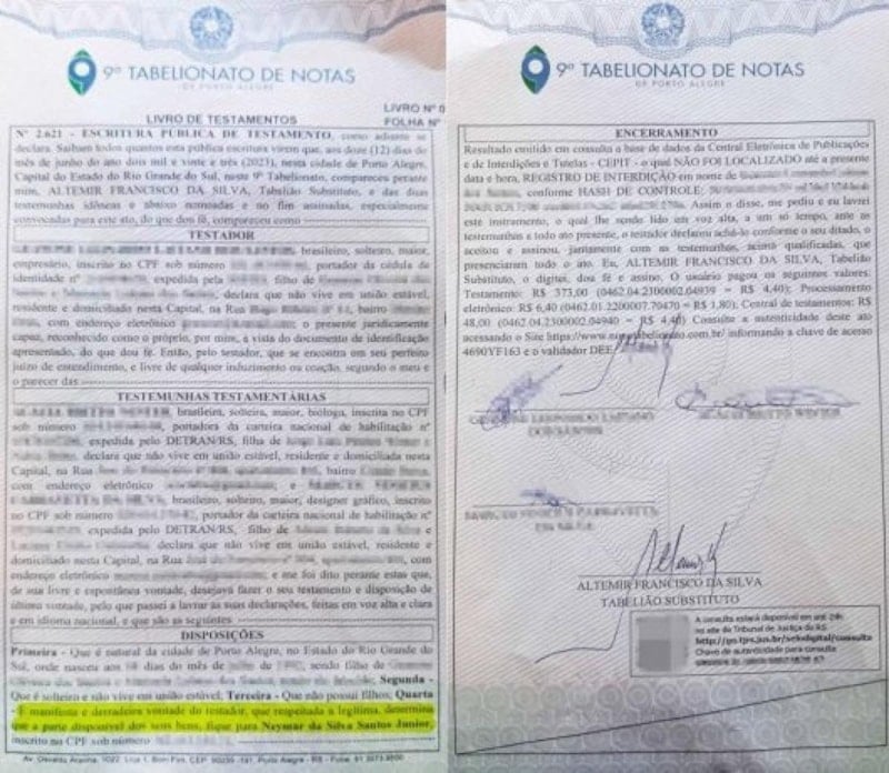 CNN Brezilya'nın aktardığı bilgilere göre; Rio Grande do Sul eyaletinde yaşayan iş insanı, vasiyetini 12 Haziran 2025 tarihinde Porto Alegre'deki 9. Noterlik'te iki tanık ve bir yetkili huzurunda resmi olarak kayda geçirdi.