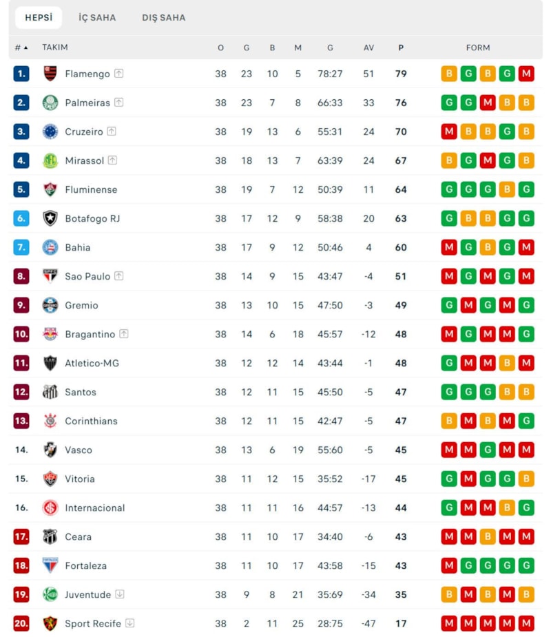 BREZİLYA LİGİ'NDE PUAN DURUMU