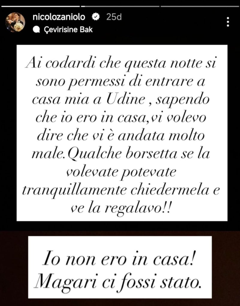 Galatasaray'ın sezon başında Udinese'ye kiraladığı Nicolo Zaniolo, eşi ve çocuklarıyla tatildeyken evi soyuldu. Yıldız oyuncu sosyal medyadan paylaştığı mesajda, "Evde değildim! Keşke olsaydım" ifadelerini kullandı.